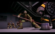 Mikey used the Bo-Staff when he was forced to poke Master Splinter with it while he was resting in "I, Monster" and managed to push the hidden button, sending the blade within inches of Splinters face.