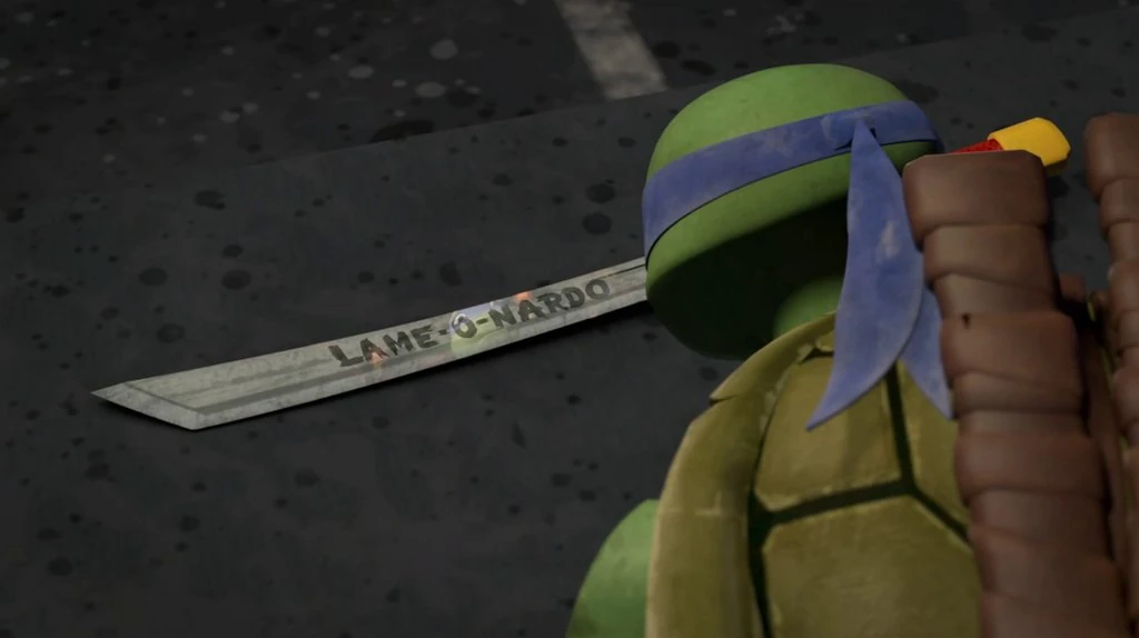 While continuing to look for more containers, Mikey yawns in boredom and states that the search is getting too boring, so he screams very loudly in a sarcastic manner, causing Leo to tell him to stop and that they will do what he believes to be fun; ninja training. He quickly ushers his brothers to a building that's the gateway to Chinatown, telling them that what they will be 'playing' is a lot like King-Of-The-Mountain. Leo tells his brothers to try and fight their way past him with Close-Quarters-Combat. Leo ventures out on to some wires to defend his 'territory', while Raph comes up with a plan to disappoint Leo and conspires with Mikey and Donnie. Leo prepares to fight with his brothers, but Mikey puts on his earbuds and listens to music while spinning on the wires. Leo states that this isn't fighting, but Mikey says nothing and just bounces around, making Leo lose a lot of his focus, allowing Mikey to do a jump-flip across the wires and on to the roof of the building behind Leo. Leo correctly states that this was not a real fight, but Donnie then steps on to the wires. Donnie uses his mathematical calculating ability to determine what surfaces to bounce Shuriken off of and strike Leo. Leo ends up using his sword to block tons of them and, after he gets exhausted, he realizes that Donnie has also made it to the other building, with Mikey. Leo asks Raph what "trick" he'll get from him. Raph says that he doesn't have any - yet!! He throws one of his Sais toward Leo, who dodges the initial attack, but then gets kicked off of the wires and on to the street, along with his two blades, one of which says "LAME-O-NARDO" on it. Leo starts to get mad and objects that his brothers are never taking his teaching seriously. Raph believes that they should have their own techniques in a battle and that Leo shouldn't try to change them. They walk away from him and Leo is left staring down at his sword unhappily.