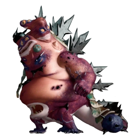 Mega Shredder resembles a blob with eyes, spikes and mouths on his heads, chest & belly. He also has a huge hulking arm and smaller, thinner arms and feet on his right side. He has metal plating, an armored tail and two stumpy feet. While we don't know much about his anatomy, we do see his stomach when Mikey gets swallowed by him. Like his outer appearance, his stomach is mostly organic but has numerous chunks of metal bulging out of the muscles. Like with any organism, it is slimy and has a pool of acid. It should also be noted that a parasite swims in the acid, and mutagenic veins line the walls.
