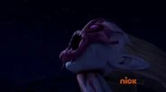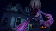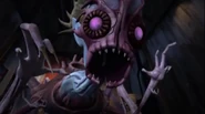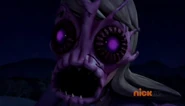 Alien Form: In-person, Mom features pink and blue skin around her body. Her face is a gooey pink Kraang-like face with big beady magenta eyes. Under the face, she has baby blue skin and large pointy ears, and her hair pointed back. If one looks closely, you can see a crack where her face can split into 2 parts. The creature has six massive long legs almost like an insect's. Featured on her back is six large sticking-up tubes that connect to her body with a crater where organs can come out and drag victims in and turn them into zombie like body parts.