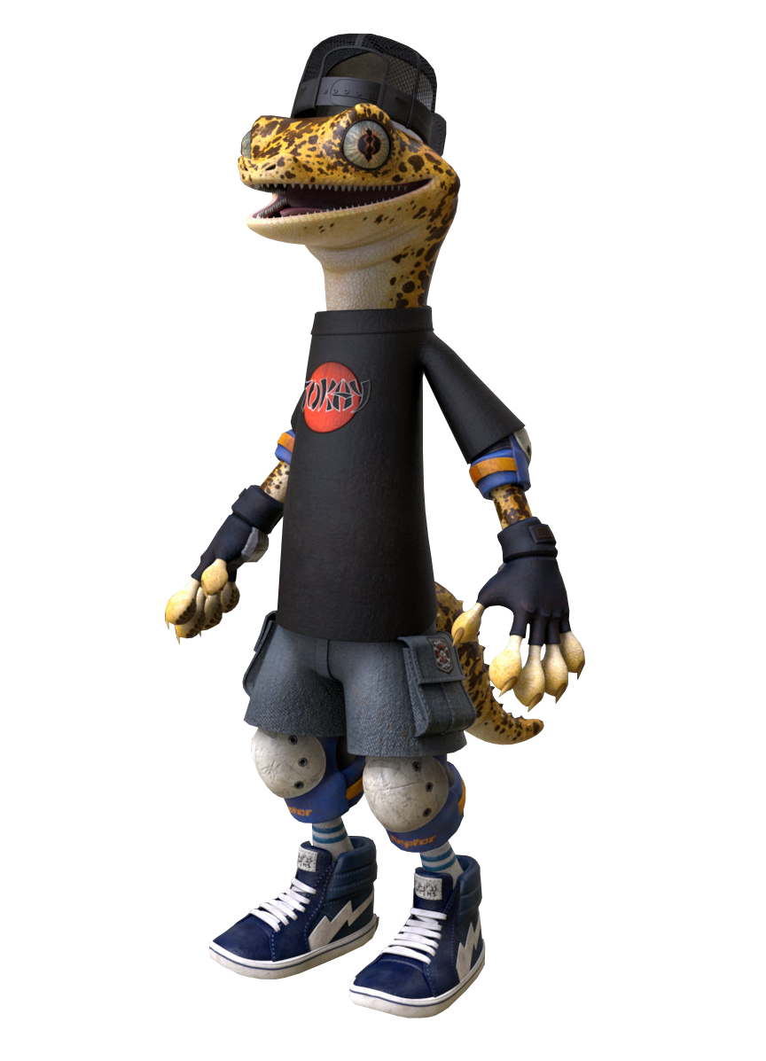 - His shirt has a sign that says Tokay, which might be a reference to a gecko species called Tokay Gecko.