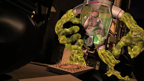 Back at the lair in his lab, Donnie vents his jealousy of Casey "seeing" April, while also installing a voice box for Timothy. Timothy tells him that he also likes April, but Donnie is too upset about what he saw to pay any attention to him. At that moment, Master Splinter calls him into the Dojo, which allows Timothy to start drinking Mutagen from another canister that Donnie left out. Splinter tells Donnie that he will teach him to enjoy falling down, which confuses Donnie. After Splinter knocks him to the floor a few times, Splinter tells him that the point of the exercise is that no one can be forced to like something. Of course, Donnie realizes that he means that he can't force April to like him. Unbeknownst to Donnie and Splinter, Timothy is forming sludgy arms and legs because of the Mutagen that he drank and he breaks free to look for April on the surface. He tries to get some one to help him find her, but everyone is clearly terrified of him.