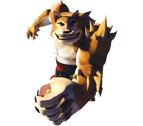 As Dogpound: Dogpound has orange fur over the majority of his body, and white fur on his palms and stomach area. His most notable features includes large, jagged spikes running up his spine. He also has spikes protruding from his left shoulder. His right hand is completely encrusted in the same material as his spikes were - and could be effectively used to block attacks from swords, sai, etc. There is also a notable difference in the size of his two arms; His left arm is much larger than his right one, and his right arm is quite a bit shorter and smaller than his left. He still wears the pants of his original human suit, though they are torn at the cuff of the pant legs.