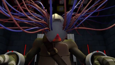 As Splinter faces Karai to his reluctance after defeating Tiger Claw with assistance from a bound April, the Turtles realize that they are in rooms adjacent to one another and begin to form a plan of escape together. Donnie's obstacle is proving particularly difficult, as he is zapped over and over again upon making mistakes. Leo manages to jump beneath the "Courage Slayer'' just before it reaches the floor of his room, and both he and the machine fall into Raph's room where Raph is narrowly clinging onto life. Splinter manages to knock the sword out of Karai's hand and begs her to not make him fight. Karai then changes back into her serpent form, remarking that he has no choice, as April frees herself from her shackles. Meanwhile, Leo removes bricks from a wall in Raph's room with a Katana from the deactivated "Courage Slayer". He manages to slice an electrical cord outside, shutting off the heat in the room. Raph and Leo then break into Mikey's room, cutting him loose from his restraints just as he is about to get doused with Mutagen. Last but not least, Mikey, Raph, and Leo break into Donnie's room as he continues to get zapped. Leo prepares to slice off the helmet, but Donnie says that it's totally wired and that the action of slicing it off would fry him instead of free him. Mikey then bravely removes the helmet with his own hands, leaving Donnie awestruck.
