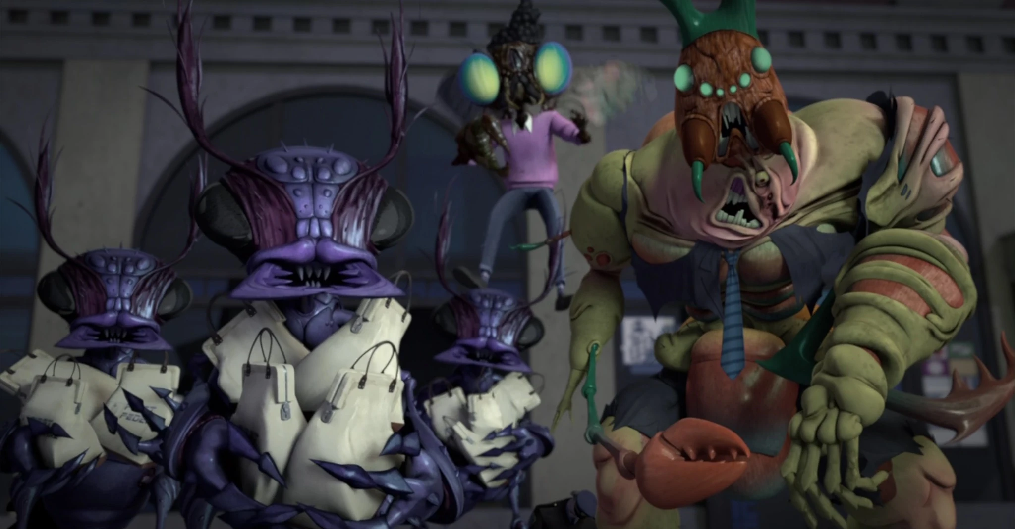 Stockman and his two new mutant henchmen have just broken into a bank. When the two arriving NYPD officers demand they surrender or they'll open fire, they are quickly overpowered and incapacitated. Raph and Casey soon show up, but unfortunately for Casey, one look at Stockman and his henchman, and Raph suffers a major panic attack from his fear of bugs, complete with a hallucination of being attacked by Lord Dregg and Cockroach Terminator, and trying to rescue Mona Lisa from them, leaving Casey to fend for himself and is soon captured after Raph runs away in terror.