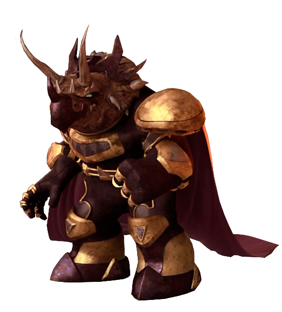 Zanmoran is a towering Triceraton who is clad in bronze armor with gold shoulder plates, gauntlets, collar, and belt. He also has multiple horns coming out of his head, uncommon for a normal Triceraton. He also has a flowing crimson cape.