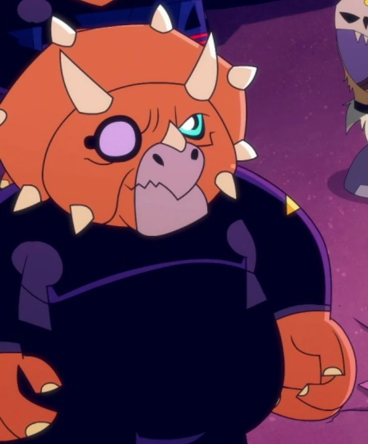 Zorg looks like any Triceraton soldier but wearing a monocle on his right eye. Zorg is also more heavy set than the other Triceraton warriors.